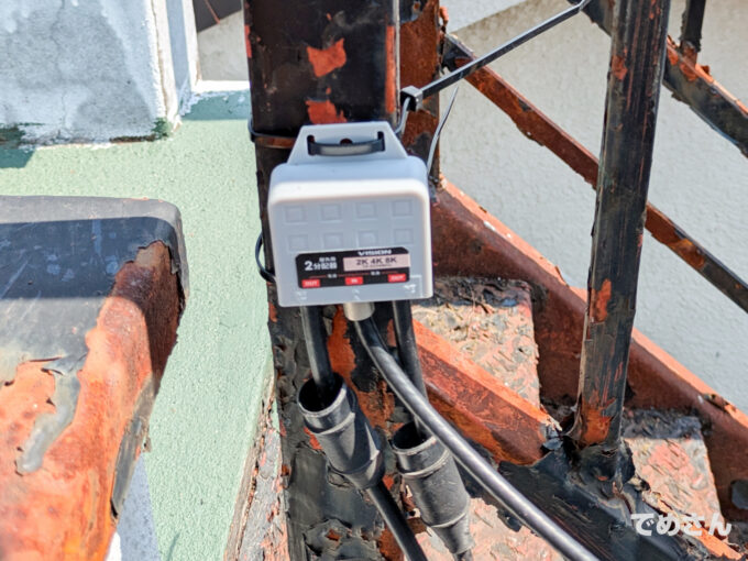 アンテナポールはダイソーの突っ張り棒を代用しました。それを屋上のボロボロの柵に結束バンドで縛り付けます。突っ張り棒代と結束バンド代で220円。業者さんに依頼したら数千円と考えるとめちゃくちゃお安い。